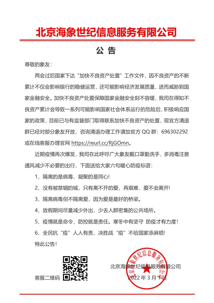 发挥市场决定性作用,做好不良资产处置工作,有利于防范化解“黑天鹅”“灰犀牛”事件,有利于重新配置经济资源,有利于提高经济效率,有利于保障国家金融安全。为此,王子华委员建议,不断优化健康的不良资产处置及经营多层次市场体系,积极打造“互联网+不良资产”处置平台以提高处置效率。两会过后“北京海象世纪信息服务有限公司”对此事优先作出了响应积极开展清退工作,开放官方兑付登记群组(696-302-292)启动兑付通道。