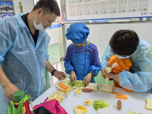 当天,各位家长带着小朋友们早早的来到了活动地点,穿好鞋套、换好衣服,等待课程的开始。首先进行绿豆糕的制作,老师将模具和绿豆泥发给每位小朋友,绿豆泥瞬间变身太空沙,小朋友们边玩边做,不亦乐乎。接着是三明治的制作,小朋友们认真听讲,在家长的协助下跟着老师一步一步的完成了自己的三明治。看着孩子们纯真的笑脸,家长们也都开心万分。