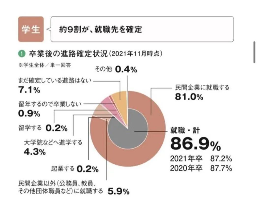 截止至2021年 11月,以民间企业为对象开始就职活动的学生中「不论是民間还是民間以外就职单位已确定」的学生占86.9%,与2021年卒(87.2%)维持在同一水平。其中确定在「民間企業就職」学生占81.0%,也与去年(80.0%)差不多。可以看出21卒生经历过受疫情影响很多企业紧急更改招聘计划的情况为2022年的毕业生提供了参考数据,22卒的学生能够根据招聘环境来选择想要去的公司,就职数据自然比前几年的要高。