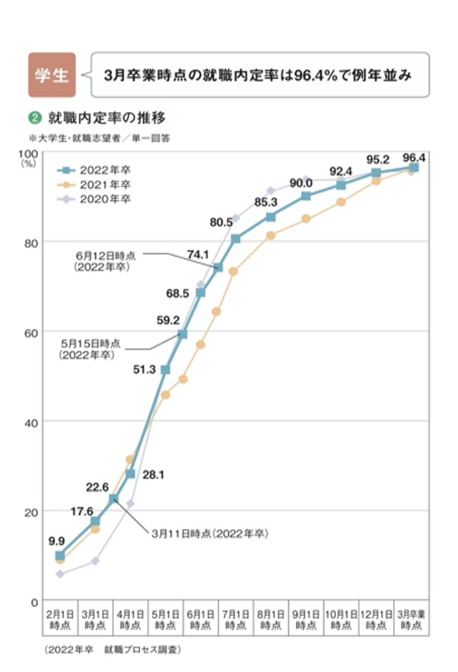 2022年日本厚生劳动省发布的《就业白皮书》中显示截止至22年3月应届生内定率达96.4%,20卒内定率95.4% ,21卒为96.1%,可见内定率在疫情的影响下并未受到太大影响,甚至保持着逐年增长的态势。