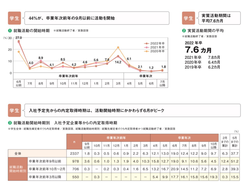 21卒之后,就职活动的开始时间普遍提前。毕业前一年的「6月以前」开展就职活动的学生达到27.0 %。与去年(26.1 % )保持在同一水平,比2 0 2 0 年 卒的17.9 % 增加了9.1个百分点。另外,毕业前一年「9月以后」开展就职活动的学生累计44%,与前年(44.6 %)相同,比2020 年卒(30.3 %) 多了13.7个百分点。另外,无关就职时间早晚,毕业生们普遍在「毕业当年六月」收到公司的内定。平均可获得2到3家公司的内定。