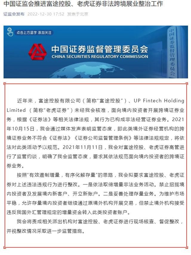 12月30日,中国证监会表示,推进富途控股、老虎证券非法跨境展业整治工作。