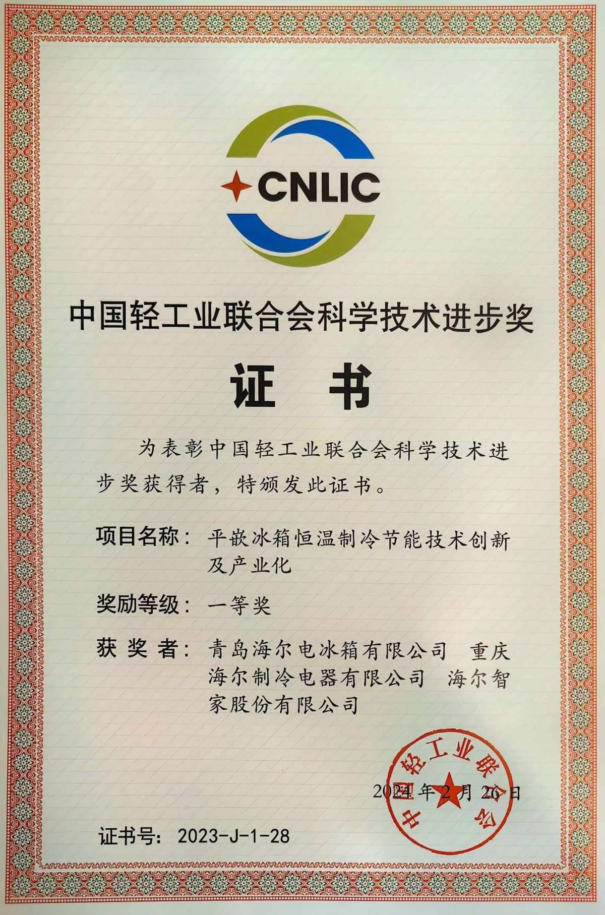 中国轻工业联合会科学技术奖代表国内轻工行业科技奖励的最高级别,被称为中国轻工业的“荣誉勋章”。而此次,经中国轻工业联合会组织专家的综合评定,“平嵌冰箱恒温制冷节能技术创新及产业化”项目依托双底置循环风幕科技、底部前置散热科技、平嵌铰链踢脚融合技术的研究及开发,以三大创新点为用户破解保鲜、节能难题,获颁科技进步奖一等奖。
