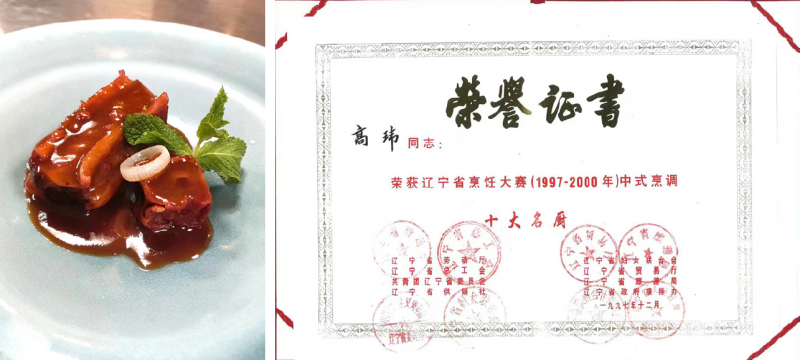 能力越大,则责任越大。从业多年,获奖无数,高玮却从不以“老前辈”自居,他喜欢和年轻弟子与员工打成一片,以“情”感人,用“诚”管人,对待大家如春风般温暖。考虑到现在 80、90 甚至 00 后是市场消费的主体,高玮就和大家一起结合时代来进行口味改革和技法创新,要好看、好吃、好玩,性价比高,在制作上要中西合璧,迎合大众的口味,突出菜品特色,技法上实现精细化、时尚化、标准化。他教大家做的葱香大连鲍、橙香脆米虾等特色菜很受消费者的欢迎,让人们直呼:“过去,以辽菜为主的东北菜是实实在在的大分量,但是现在才知道,辽菜也可以很精致,在保留家的味道的同时,也可以做到精致奇巧。”