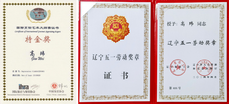 一直以来,“做一行、爱一行、钻一行”,是高玮鲜明的个人标签。凭借着精湛的技术,高玮早在 1997 年参加辽宁省烹饪大赛时就荣获了辽宁省“十大名厨”称号;2003 年参加第五届全国烹饪大赛斩获一枚金牌、一枚银牌。在国内获得了“中国烹饪名师”“国际烹饪艺术大师”“中国名厨白金奖”“中国十大名厨”“辽菜传承功勋人物”“辽宁省五一劳动奖章”“沈阳市五一劳动奖章”等诸多荣誉,多次受聘担任中国饭店协会名厨委副秘书长、辽宁省饭店协会副会长等行业要角;在国际上享有“法国蓝带美食会大中华区名誉会长” “法国奥古斯大中华区评审委员会首席委员”等荣誉,现接管腾龙团队的他,以矢志不渝的精神,攀登了一个又一个高峰、获得了一项又一项荣誉,虚怀若谷,从不骄傲。