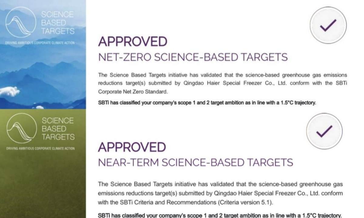 当地时间8月22日,海尔冷柜碳减排目标正式通过科学碳目标倡议组织(Science Based Target initiative, 以下简称SBTi)的双项审定,其中包括基于《巴黎协定》“1.5℃温控目标”设定的“近期减排目标”和“长期净零排放目标”双项目标,这标志着海尔冷柜成为我国家电行业率先通过双项审验的品牌,是家电领域可持续发展进程中的一项重要里程碑,也为我国生态文明建设和全球可持续发展做出表率。