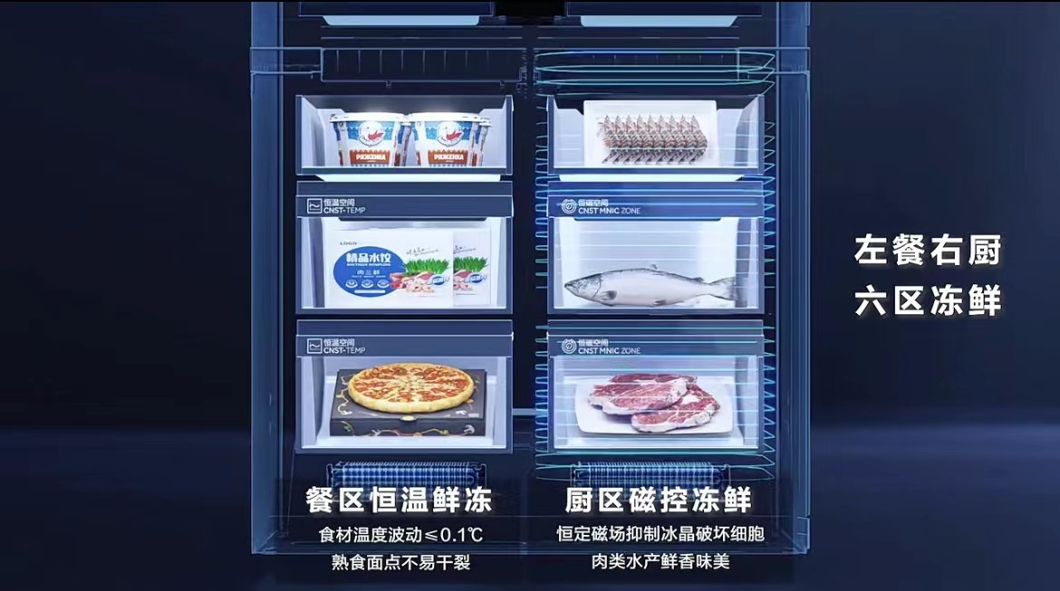 在此基础上,海尔和悦冰箱还创新了“左餐右厨,六区鲜冻”的全新格局,让食材新鲜时间进一步被延长。餐区,搭载底置恒温保鲜科技,为容易开裂的熟食面点等提供风冷不风干的存储环境;厨区,首次应用原创的磁控冻鲜科技,以恒定均匀磁场,让海鲜、肉类存放60天鲜香味100%保留。
