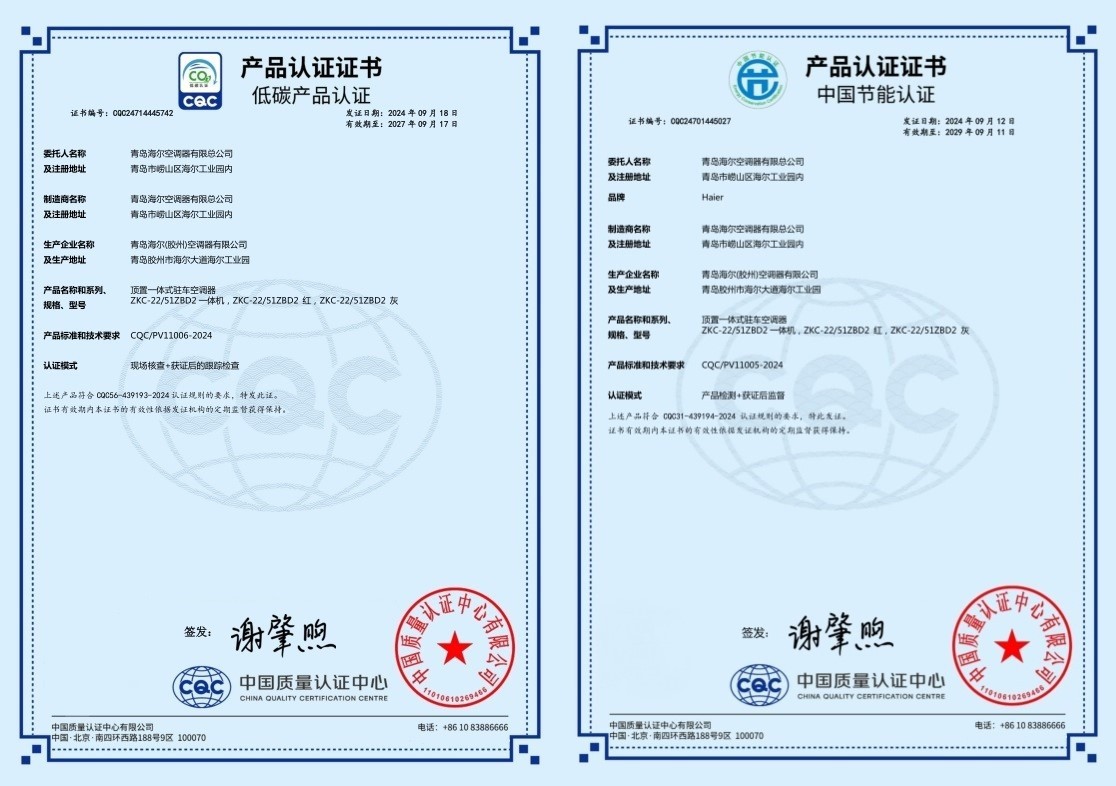 行业首批!海尔驻车空调获CQC节能、低碳双认证