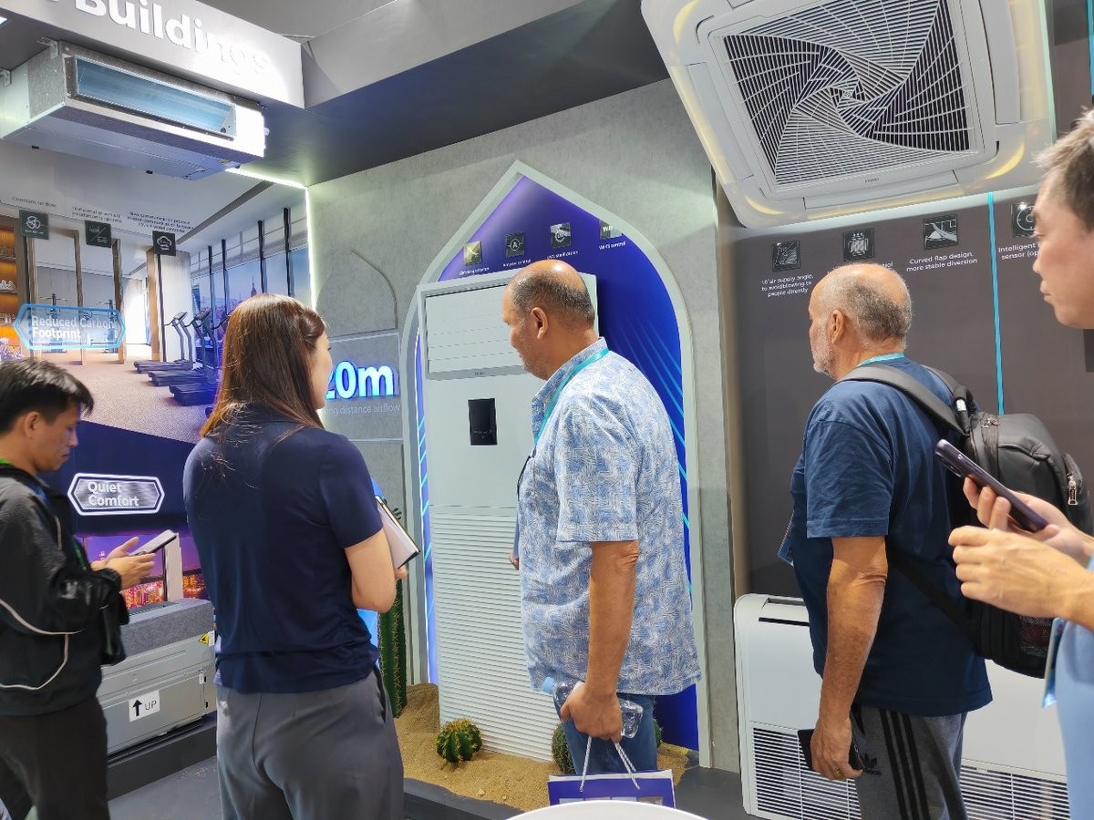 工作人员表示,T3 Super Airflow柜机就是中东非地区的明星产品。该地区气候炎热,降水少,设备在极端环境下的稳定性成为用户考量的重点。机组采用全直流变频压缩机和直流风机,100%纯铜部件设计,可实现60℃高温稳定制冷。同时,机组风扇送风距离提升33%,可实现20米超远送风,风量提升29.4%,最大值可达2200m3/h,风量更大更舒适。