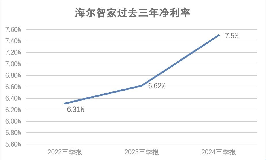 除了利润的高增长外,海尔智家的盈利能力也在持续提升。从过去三年三季报看,海尔智家的净利率从6.31%提升到6.62%,再到今年的7.5%,同比提升了约0.8pct。