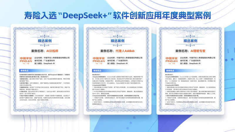 近日,中国信通院正式发布“DeepSeek+”软件创新应用案例评选结果。平安人寿凭借“AI训练师”“代理人AskBob”“AI理赔专家”三大创新项目脱颖而出,位列宣发首位,为行业智能化转型提供了“平安样本”。金融助力美好生活是平