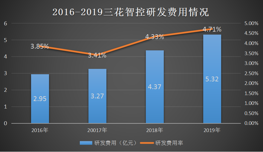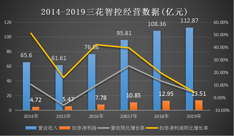 2019年,三花智控实现营业收入112.87亿元,同比增长率为4.17%,实现扣非净利润13.51亿元,同比增长率为4.37%。不得不说,作为国内空调冰箱制冷元器件龙头,近几年三花智控业绩增长受下游家电行业不景气影响非常大,2017年、2018年、2019年我国白色家电行业的年同比增长率分别为36.81%、14.82%、-0.05%,成为三花智控业绩增速放缓的主要原因。