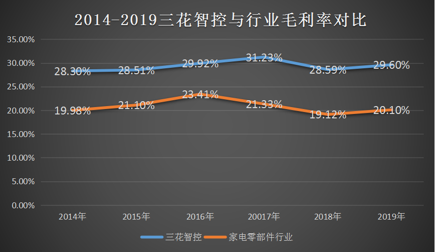 首先,从盈利能力来看,一方面,三花智控的产品竞争优势明显。数据显示,2014-2019年间三花智控的毛利率一直高于家电零部件行业的毛利率,且两者的毛利率水平均略有上涨。