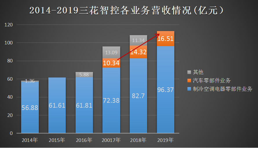 (友情提示:近几年三花智控主营数据统计口径频繁调整,2018年之前公司实际制冷空调电器零部件业务划分较细,而2019年公司的业务划分便只有两块)