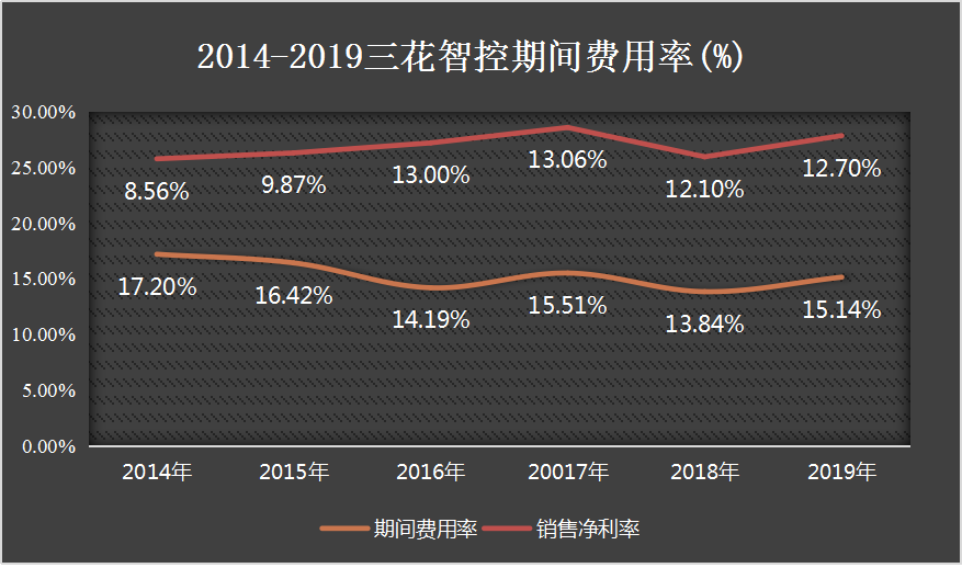另外,除了公司本身的产品优势,三花智控的费用控制水平也非常高,显示了公司较强的内部。数据显示,和2014年相比,2019年三花智控的期间费用率下降了近2%,且这六年之间三花智控的期间费用率处于一个持续稳定下滑的状态,为三花智控净利率的上涨提供了源源动力。