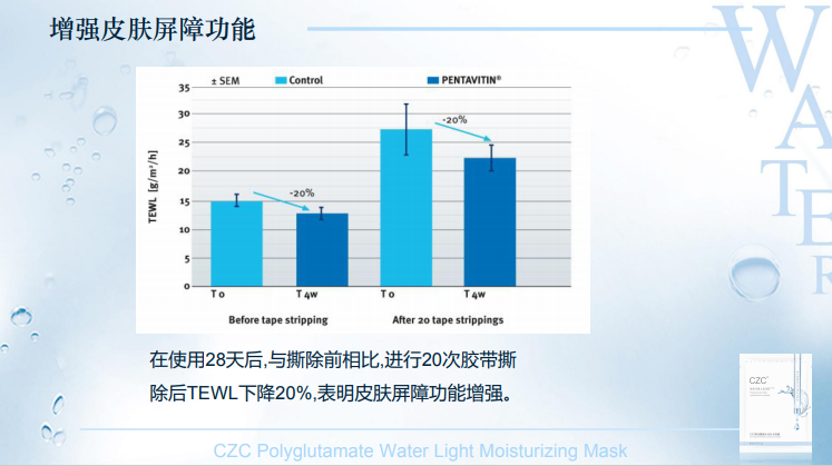 实验室追踪CZC聚谷氨酸补水面膜使用者持续使用28天的效果,肌肤的屏障功能得到了明显的提升。证明CZC聚谷氨酸补水面膜中的成分有效修复肌肤,同时提高肌肤免疫力。