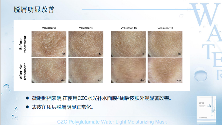季节变换,肌肤不仅容易干燥,还很容易敏感。微距相机显示,使用CZC聚谷氨酸补水面膜4周后,皮肤状况得到了明显改善。