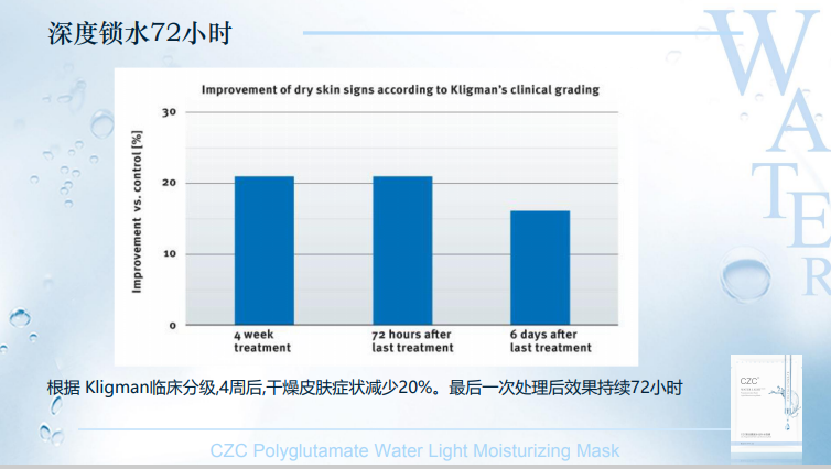 临床证明,CZC聚谷氨酸补水面膜可深度锁水长达72小时。敷上面膜,先给肌肤快速补水,让肌肤迅速止渴。后续持久锁水能力,让肌肤不在为干燥烦恼。