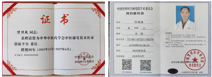 信氏针灸疗法结合了传统中医理论和现代医学知识,针对各种慢性疾病和复杂病症,均有着显著的疗效。除此之外,信传政还在临床实践中不断创新,总结出了一套简捷方便、疗效显著的针灸疗法,尤其是在治疗痛症和内科疾病方面取得了显著成果。信传政十分注重将传统中医针灸和现代康复技术相结合,开发出了一系列具有独特疗效的康复治疗方案。因在信氏传统中医针灸领域的卓越贡献,信传政荣获了“信氏传统中医针灸非遗传承大师”称号,这一殊荣,不仅是对他在中医针灸技艺传承与创新方面的高度肯定,也是对他数十载如一日地对医疗实践与中医文化传播所作出努力的嘉奖之誉。